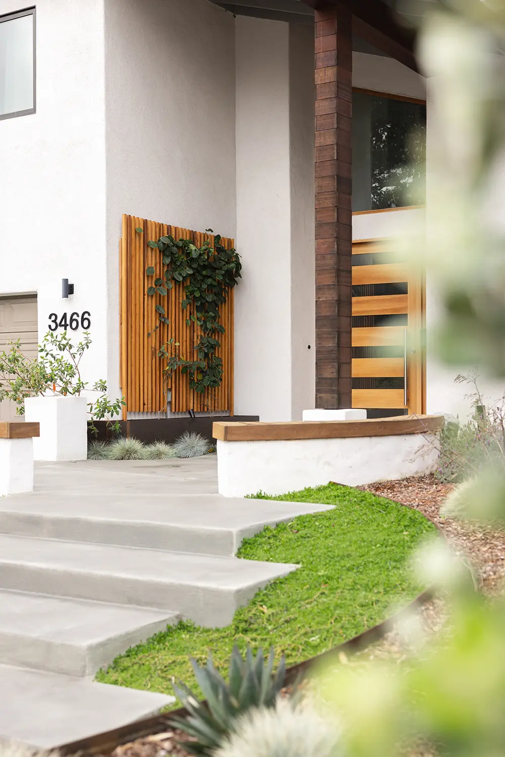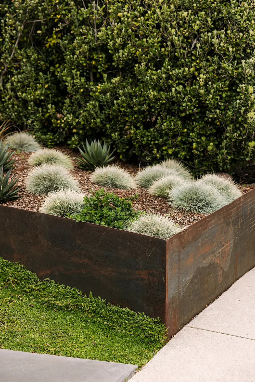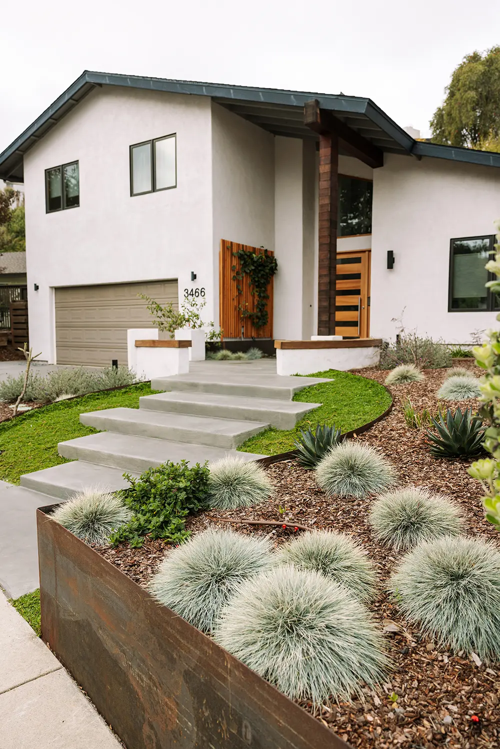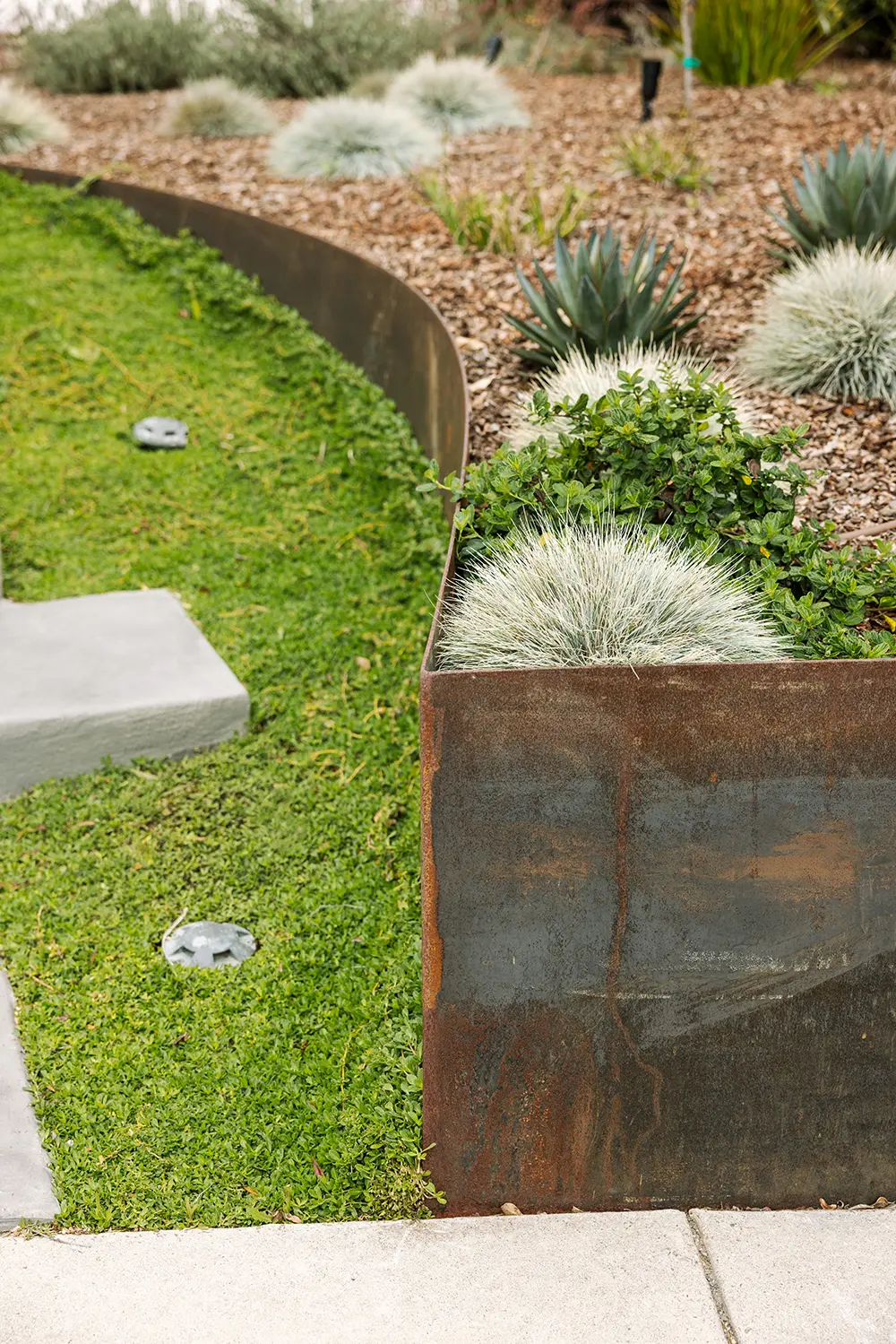 This lovely customer in Bay Park trusted us to push some limits with shapes and materials choices in order to solve their needs. We chose to rely on sculptural custom steel walls as the focal point, to act as retaining walls and planters. The large redwood tree and architecture of the house called for a wood boardwalk, with a seating wall cap and trellis to match. The entry stairs sit in the lush green of kurapia groundcover.