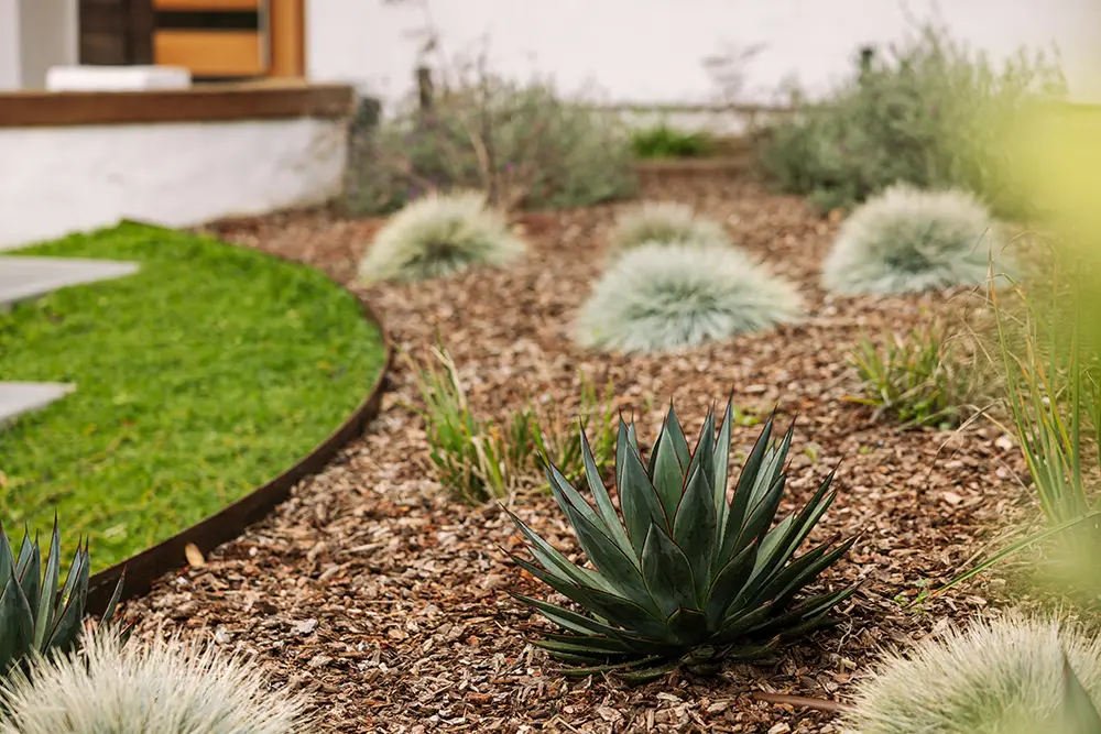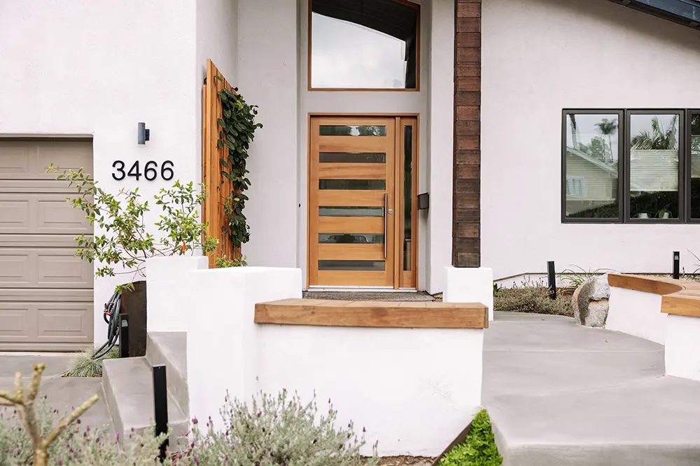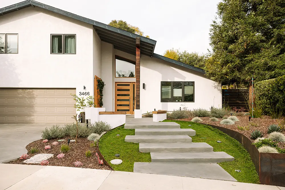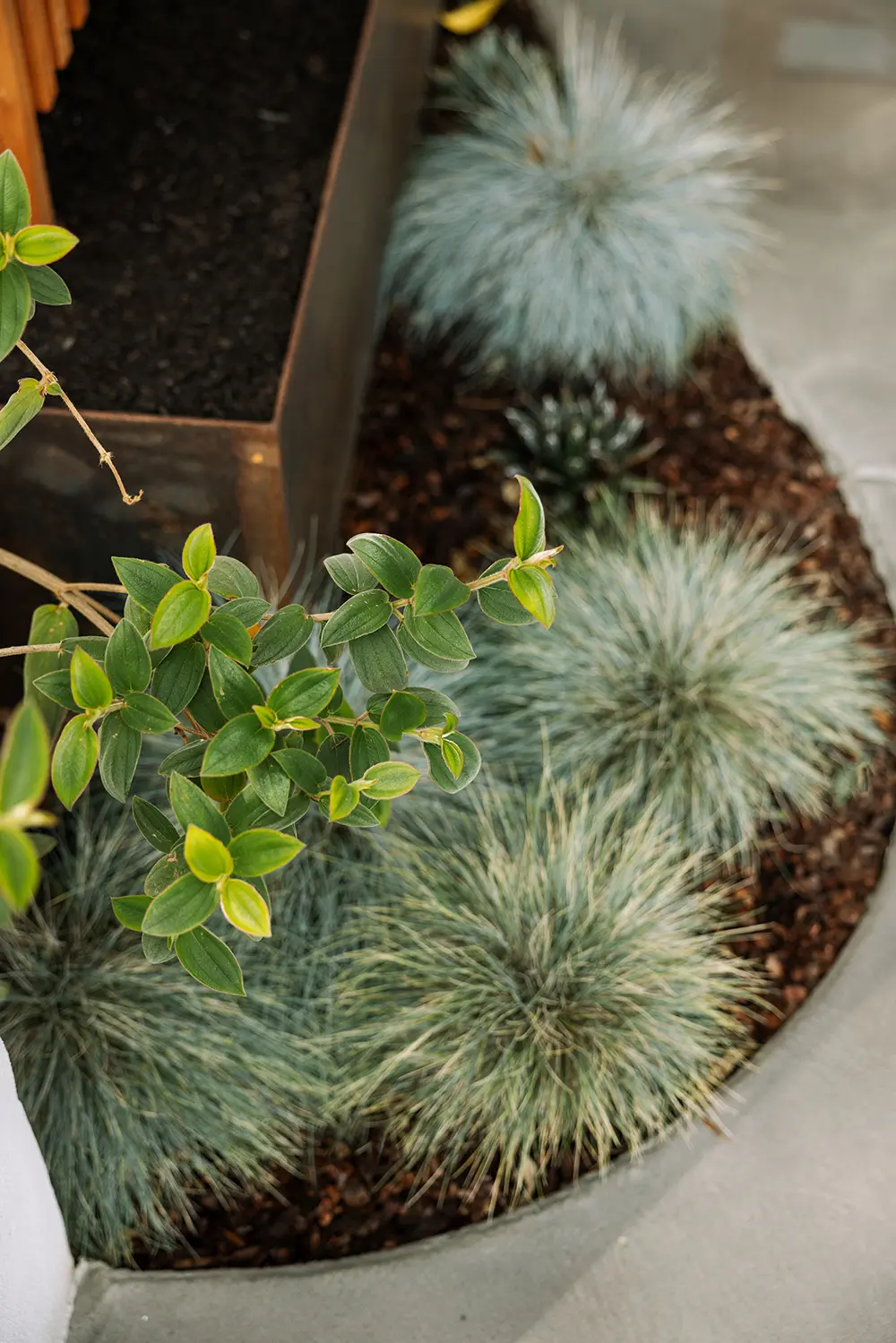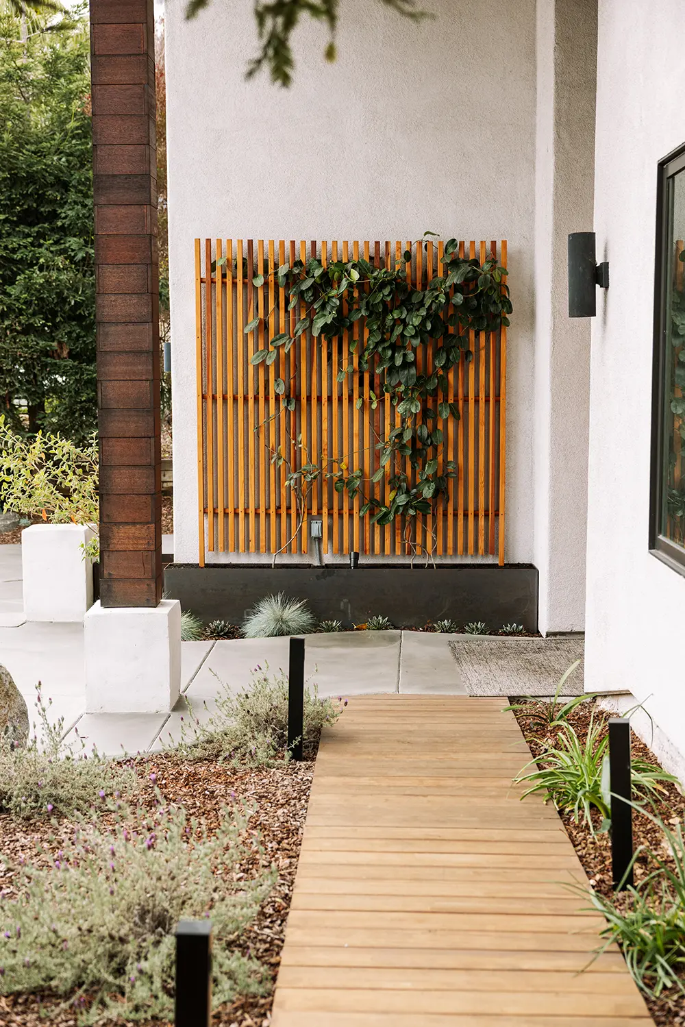 This lovely customer in Bay Park trusted us to push some limits with shapes and materials choices in order to solve their needs. We chose to rely on sculptural custom steel walls as the focal point, to act as retaining walls and planters. The large redwood tree and architecture of the house called for a wood boardwalk, with a seating wall cap and trellis to match. The entry stairs sit in the lush green of kurapia groundcover.