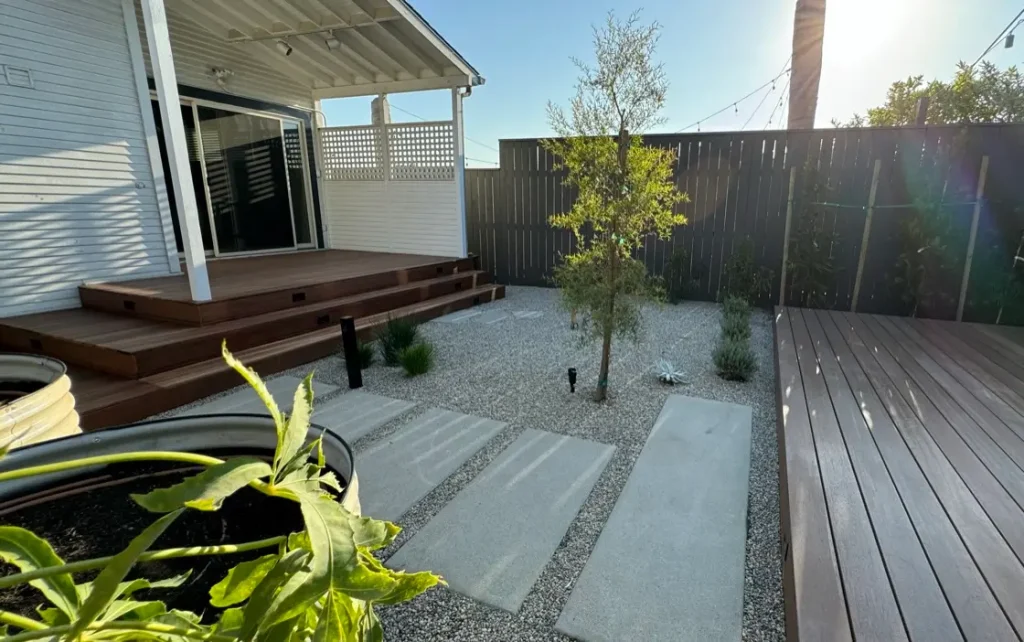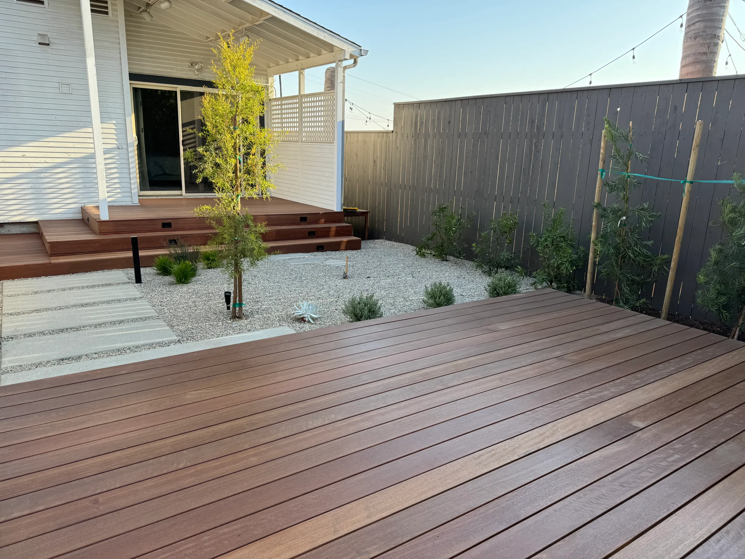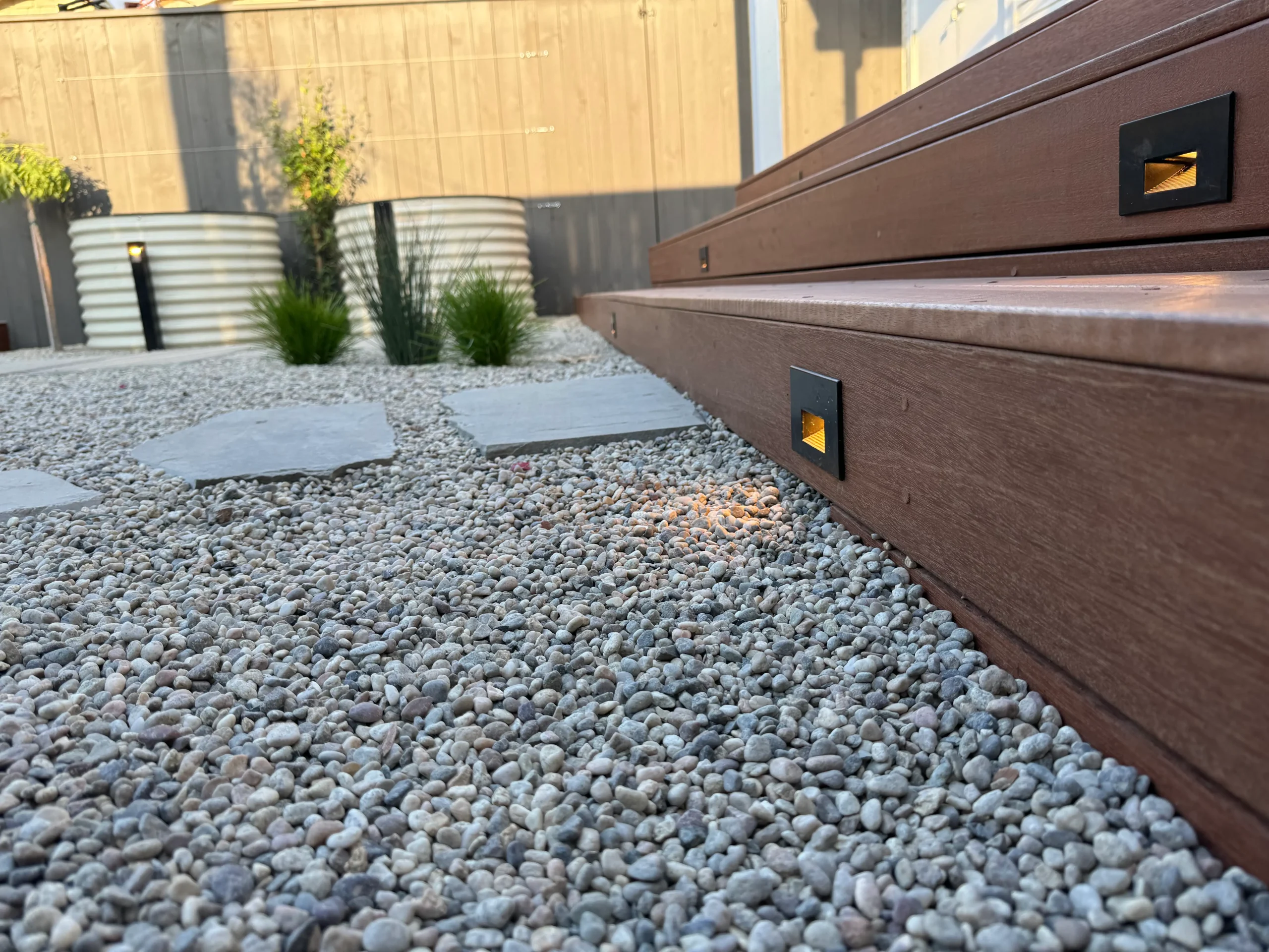 This client’s yard was an unusable mess when they bought their house. We opened it up with new Mangaris decks and wide stairs that extend the porch into the landscape. Clean gravel, bold fencing, raised kitchen gardens, and concrete paths give the space structure and softness. We added a firepit lounge, modern lighting, and a second deck for dining off the office. The contemporary layout, plants and materials selections make this a classic landscape that looks great and feels great to be in.